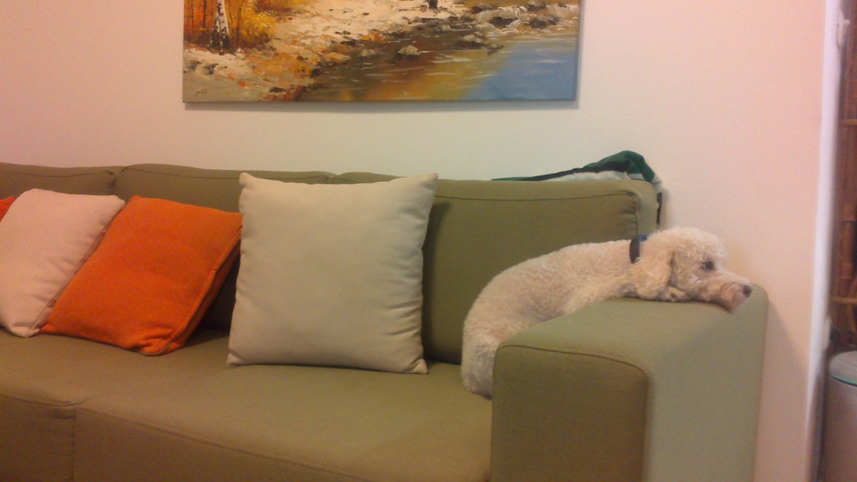 Pepo, his poodle dog, was sitting beside him most of the time. When Guy stood up, he stayed on the sofa looking a bit sad, but I have the feeling he just knew I was taking a picture of him!